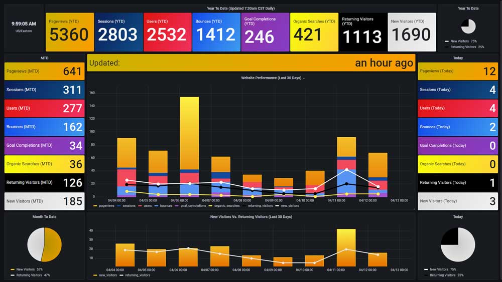 A critical dashboard when operating an online presence, the Google Analytics dashboard reveals and visualizes several important datapoints, extracted in real time from the branded Google Analtyics API. Showing metrics ranging from one year, one month, one day, and live, the Google Analytics dashboard allows users to make whiplash-quick decisions regarding marketing initiatives, active feedback processes and product direction.